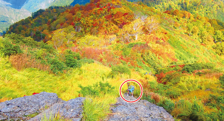 前日(8日)三島町の志津倉山山行中に、右太腿をアシナガバチに刺され、痛みと痒みで十分に眠れなかった。30数年前にスズメバチに刺されアレルギー反応が、重症化することを心配していた相棒に朝一番で状況を診てもらうと、「熱もあり腫れているから無理をしないほうがいい」と。一度は会津朝日岳への登山を諦めたものの、民宿を出るときに年老いた主から、「痒みが出てきたらもう大丈夫、今日は快晴だから良い登山を!」と気合を入れられ、一気に登山モードに、相棒からは「痛みが出たら絶対に戻るよ」と、キツク何度も言われながら赤倉沢登山口へ。登山口へのアクセスがあまり良くない会津朝日岳であるが、圧巻の紅葉広がる隠れた名峰で人気が高く、既に22台の県内外ナンバーの車で駐車場はほぼ満杯状態、よう やく1台駐車できるスペースを確保、はやる気持ちを抑えてのスタート準備となる。右太腿の状態を改めて確認してから、7時56分に駐車場奥の赤倉沢に架かる木橋を渡ってスタート、山頂までの比高は登山口の標高が約561mであるため、1,063mとなる。沢に沿って幅の広い平坦な道を行き、3本目の沢を渡ると道幅は狭く本格的な登山道となる。ここからは傾斜がキツク、峡谷の様相となり西側に大きな山塊が迫ってくる、ロープが張ってある最後の急沢を渡渉すると道の傾斜はますますキツクなる。気温は20度で湿度も80%超え、この時期にしては高く体感的には盛夏の山を登っているように、一気に体中の汗が絞られる。焦らず慎重に進むと、登山道唯一の水場である「三吉ミチギ」に8時51分(登り始めて55分)に到着、ここで水分を補給しついでに右太腿を冷やして、これから始まる九十九折れの急登に備え行動食のバナナで体調を整える。展望のない急勾配の九十九折れは風景が変化せず、辛抱と根気が絶対条件となるが、今はブナの葉が黄色を中心とした紅葉となっており、風景を愛でながら快適に登ることが出来る。落葉した木々の間から、東側に山並みを覆う雲海が眺望できるようになると高度感はぐっと増してくる。葉の重なりが薄く陽射しも強くなり、明るく感じられるようになると、苦しかった九十九折れが終わり、尾根突端の「人見の松」に9時53分(登り始めて1時間57分)に到着する。山頂までは、2.6kmの道標がある「人見の松」は展望そして、キツイ傾斜の登山道の終わりを告げるスポットで、ここを乗り越えればこの腫れあがった右太腿であっても 頂を踏むことができると、安堵感に包まれる。少しずつ近づいてくる頂そして全山紅葉風景に圧倒され、目をとられると露岩に足を滑らせることになる。ここは慎重に露岩帯を進み、尾根を一旦下って登り返せば、会津朝日岳の前衛峰、「叶の高手(1,430m)」に10時15分(登り始めて2時間19分)に到着する。山頂までは2.1㎞の道標がある「叶の高手」を2回目の休息ポイントとして、ナッツ類で軽めの行動食をとっていると、すでに早朝スタートした人たちの下山タイムと重なり多くの登山者とすれ違う。下山とはいっても鞍部から約120mの比高がある「叶の高手」への登り返しはキツク、それでも頂を踏みしめた余裕からか我々に対して「もうすぐだから」「紅葉がものすごくきれいだよ」と、労いの言葉をかけてくれる。朝日岳の大クロベの脇の狭い登山道を譲り合いながら下降すると、「叶の高手」から24分で1,319mの鞍部を通過する。鞍部周辺はブナの巨木にすっぽりと囲まれ、見上げると周辺のブナはもう落葉して冬支度に入っているようだ。山頂まで0.9kmの道標がある「熊の平」そして「避難小屋」を通過、やがて植生が灌木になると山頂まで500mの小ピーク「バウチの高手」に到着する。ここから山頂までは雪食地形の露岩帯となり樹木は生育できずゼンマイやミヤマイラクサといった低木類が見事な草紅葉となっている。露岩帯は滑りやすく草紅葉に目を奪われると鏡肌の岩盤に足を滑らせることになる。万が一、足を滑らせると命に係わる滑落事故となることから十分に注意をして、岩場に取り付けてあるロープをしっかり掴み、スリルを味わいながら、手足の筋肉全てをフル稼働させ稜線へ、ここにきて初めて、西側の展望が開けてくる。細い岩稜を伝って、11時35分(登り始めて3時間39分)に三角点そして山名表示盤がある、会津朝日岳山頂に到達する。山頂からの眺望は、360度の大パノラマが広がっている。数パーティがのんびりと大休止中、われわれもゆっくり休める場所を確保して、温かいうどんと民宿お手製のおにぎりで、疲れをいやすことに。まだまだのんびり風景を堪能していたいものの、右太腿が本格的に痛まぬうちに、12時19分に下山を開始する。