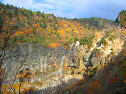 紅葉の白糸の滝を目当てに乗用車が多く入っている。あせる気持ちを抑え準備をして、午前9時50分にスタート。駐車場付近(標高 約1131m)から鉄山山頂(1709m)までの標高差は約578mとなる。登山口から白糸の滝展望台までは遊歩道として整備してあり、多くの観光客がカメラをかまえシャッターチャンスを覗っていた。ここから先は、登山道となり緩やかながらも徐々に高度を上げ登山口から40分で湯の華採取場分岐となる。ここからは、樹林帯の中の急登で、火口壁の障子ヶ岩の側壁に取り付くことになる。約50分ぬかるんだ道や木の枝に掴まり悪戦苦闘すると、向かって左側の斜面が大きく開けてくる。標高1610mの岩の縁にようやくたどり着く。牛の背から下山してきた老夫婦と言葉を交わすと、「稜線はものすごい風が吹いているので戻ってきた」とのこと。安達太良山は、強風の名所ともなっており我々も秋から冬にかけて何度となく体が吹き飛ばされそうな強風を体験している、とは言っても十分に注意をして。ここからは、沼ノ平を眼下に展望のよい尾根歩きが続き、アップダウンを繰り返せば小さな祠がある船明神山となる。樹林帯の中とは対照的な荒涼とした風景が広がっており、慎重にガレ場を進むことになる。思ったほど風は強くないが、動かないでいると寒さを感じるため、鉄山避難小屋を昼食場所とし先に進むことに。