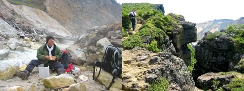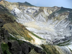 | 高村光太郎の詩集「知恵子抄」によりその名が全国的に有名になった安達太良山は福島県を代表する名山です。中通りのほぼ中央、会津との境に位置し、4号国道を福島市より南下をすると郡山市まで穏やかな山容を西に望むことが出来ます。入社以来、15年間福島から郡山まで通勤をしていた私にとって、朝車窓から見る安達太良山の眺望により一日の天気を予測し、雄大な風景に四季を感じてきました。私自身が40歳のとき登山を始めたきっかけとなったのも安達太良山でした。何かの本で、深田100名山「ラクチンの山ベスト10」の10位にランクインをし、ゴンドラ駅から標高差350m,1時間10分という見出しに、気分転換で「ちょっと登ってくるかあー」といった、軽いノリで小学校の遠足以来約30年ぶりの2000年7月に訪れました。その時は、あだたらスキー場のゴンドラを利用してどうにか登頂することが出来ましたが、暑くて苦しい山行だっただけに達成感はひとしおで下山後の温泉とビールは至福のときを与えてくれました。その後、「山登り」は私にとって、ストレスを発散させることが出来る趣味を持つことの大切さを堪能させてくれています。3階の自宅玄関(郡山市内在)を開けると、晴れていれば北側に聳える安達太良山を大きく望むことが出来ます。いつもそこにある山で、1年で最も多く登る山として(2005年は、8回)、そして幼い子供たちと母と登った山であり、私にとって非常に身近な山です。