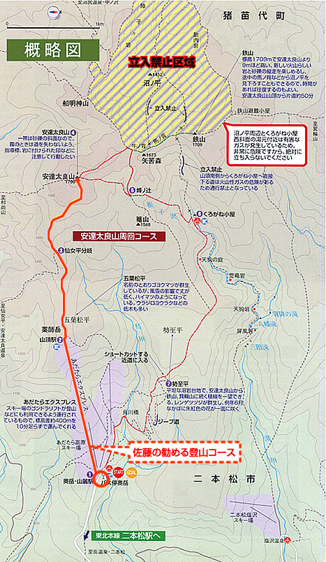 前号で第16回を迎えた、『私の山紀行』。弊社 社長の佐藤が、毎号淡々とした語り口で山登りを紹介しておりますが、ここでひといき。どうして山登りするようになったの??一体どれくらいの数を登っているの??と素朴な疑問をぶつけてみました。数年前から空前の登山ブームが巻き起こっておりますが、今後、山登りしてみたいなと思っている方には、よきアドバイスとなれば光栄です。筆者も実は登山にトライしようかなと毎年足踏みしているところ。登山の教習所があるとすれば、こちらは学科でしょうか。今後は初心者向けの実技ツアーもあるといいですね。 めざせ、山ガール! 蓬田:よろしくおねがいします。いつも清々しく登山された話ばかりなので、こぼれ話や失敗談など、登山がより身近に感じるようなお話をお願いします。 まず、初めての登山はいつで、何歳のときですか? 佐藤:2000年7月に安達太良山※1に登ったのが、記念すべき第1号です。ちょうど40歳のときでした。 蓬田:なるほど。意外に歴史は浅いですね。それから登山歴は13年間になりますかね。総計何回登りましたか? ![]() 蓬田:昨年だけで42!? 休日のほぼ半分は山の上という感じですね。特に多く登った山はどこですか? 佐藤:厳密には細かくカウントしていませんが、安達太良山と蓬田岳※2に一番多く登っていますね。両方とも、登山口が自宅から車で1時間以内の近距離にあるということ。また、様々なコースがあり、手軽に充実感を得られることが魅力です。休みは雨が降ろうが風が強かろうが『とりあえず山へ行こう』というのが私のスタイルです。 蓬田:そもそもの山を登ろうと思ったきっかけは何だったのでしょう。 佐藤:私が弊社の営業部長となった39歳(平成11年)のとき、まさに日本は不況の真っただ中でした。売上確保に日々奔走し、休日は仕事でたまった心身の疲労を癒すべく、いつもゴロゴロして過ごしていました。ストレス解消といえば飲み会。体重は増え、肝機能は悪化、典型的な中年オヤジとなってしまいました。それを見るに見かねた妻が『ねぇ、気分転換に山に行こうよ。』誘ってきました。『疲れるから嫌だ。』と何度か断り続けたものの、さすがに申し訳なく思い、一度やってみるか。と重い腰を上げたのがきっかけです。 蓬田:では523回の登山は奥様とお二人で? 佐藤:数回のツアー登山を除けば、7割が妻とで、残りが単独行です。 蓬田:ご夫婦で共通の趣味。ストレス発散もできて、夫婦円満。良いことずくめですね。 佐藤:そうですね。山頂に立つと、とてもさわやかな気分となります。体中が達成感で満ち溢れます。頂上からの眺めの素晴らしさに、また登りたいという気持ちが湧き上がります。下山後の温泉とビールもまた格別です。また、登山のおかげで、20数年手放せなかったタバコとも縁を切ることができました。 ![]() 佐藤:もちろんありますよ。毎度、登山口をスタートして15分から30分くらいは、『どうしてこんなにしんどい思いまでして登るかなぁ、俺は。』と後悔の念に苛まれますが、時間とともに呼吸のペースも掴むことができます。自分がいるべき場所に帰ってきたような気がします。 蓬田:山で一番好きな季節はいつですか? 佐藤:いつが一番というのはありませんね。私にとってはどの季節も登山に適しています。特に、季節の変わり目に出会えた時は感動しますね。3月の低山で春の息吹が感じられたときは、モノクロの世界がカラーに一遍したような感覚となります。 蓬田:なるほど。それは山登りしないと体験し得ない感動ですね。さて、わたしもトライ!といきたいところですが、私のようなビギナー向けにはどこがオススメですか? 佐藤:私にとっても初登山となった、安達太良山がオススメです。ゴンドラを利用し、薬師岳山頂駅(概略図参照)から標高差350m。私の初登山の登りのタイムが1時間10分でしたので、それほど苦にはならないと思います。ゴンドラで途中まで行けますから、子供連れでも楽しく登れると思います。 蓬田:ゴンドラリフトの出発点である、あだたら高原スキー場まで、郡山市内から車で1時間ほどですから、お休みに日帰りでファミリー登山にはうってつけですね。実は私、小学生のときに安達太良山には家族で登ったことがあります。父が高校のときに山岳部だったので、いいところを見せようとはりきって家族を連れて行きました。その時は強制的だったので、イヤイヤでしたが。今なら楽しめそう。 佐藤:山開きが行われる5月から雪が降る前の10月頃が登りやすい時ですね。季節もいいですし、名山は大勢の人で賑わっています。ちょっとしたアクシデント時でも、一人じゃないということが安心につながります。 蓬田:今まで登った山で一番遠方だとどこですか?また、一番高い山は? 佐藤:遠いところだと、北海道の大雪山。標高が高いところは、北アルプス南部の西穂高岳※3。西穂高岳はツアー登山でしたが、慣れない車中泊に苦労しました。 蓬田:ほかに失敗談はあり