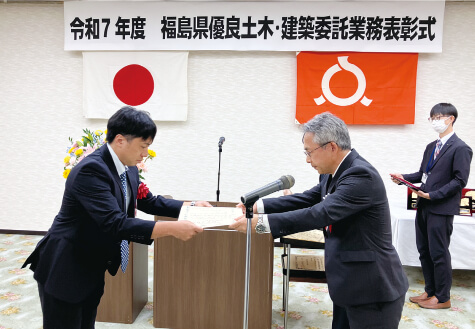 この度の、福島県優良委託業務表彰の受賞は当社の若手技術者の受賞ということで、個人の技術力はもちろんのこと、当社が若手の育成に力をいれていること、そして若手一人ひとりが持つ新しい発想や熱意を尊重する企業文化が評価されたものと確信しています。