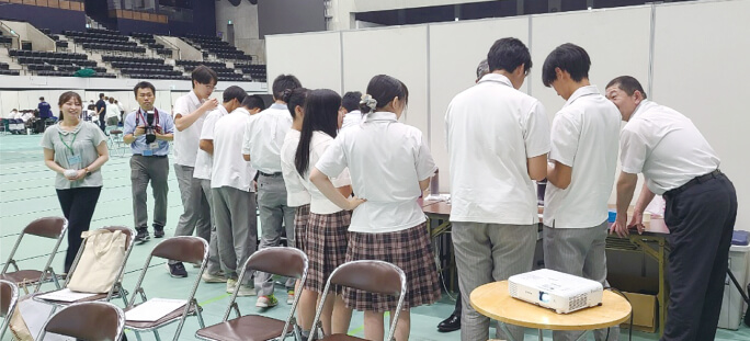 「安全な水の検査体験と飲用水の特性理解」という題目でパックテストを使用した水の硬度測定を体験していただきました。普段触れることのない検査キットは学生さん達に好評で、水処理機の仕組みを興味深く聞いていただけたのが印象的です。