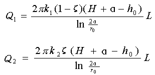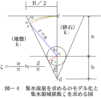 - 流量:地盤と埋没した砕石の透水係数や水質分析の結果から明らかなように、集水管に流入する流水は、地盤と埋戻した砕石を通ってくる地下水と河川水である。図−1の断面を図−4のようにモデル化し、集水領域係数ζとを導入して、地盤からの流量Q1と砕石を通して流入する河川水流量Q2を、次式で算定した。