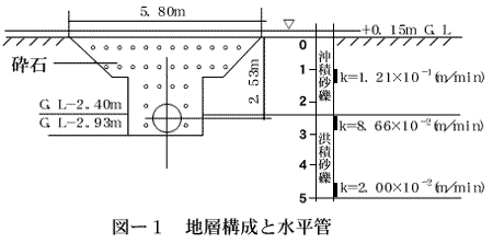 水平集水管と地層構成を図-1に示す。予察により減水の原因を、@地下水中に含有する鉄分(0.7mg/l)などによって有孔部分が酸化して目づまりを起こした場合、Aフィルター材として埋戻した砕石の堆砂によって目づまりした場合の2通として調査を行った。