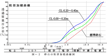 各深さにおける透水試験の結果をまとめると、表−1に示すとおりである。地層が深くなるにつれて透水係数の値が小さくなる傾向を示している。- 埋戻し砕石(フィルター)の粒度:図−2に埋戻しに使用した標準砕石と、採取した砕石の粒度試験結果を、粒径加積曲線として示す。標準砕石に比べ、明らかに細粒子分が増加している。粒径D20が、0.03mm以上である粗粒土の透水係数は、k=0.36D202.37(cm/s)で推定することが出来る。この方法で各砕石の透水係数の値を推定すると、表−2となり、採取した砕石は、当初の砕石の透水係数の1/8〜1/14の値に低下している。この値は地盤の透水係数に近い。