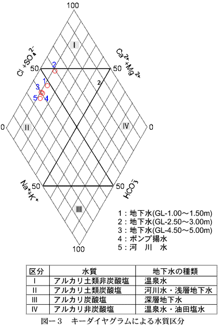 - 水質区分:水質分析結果をキーダイヤグラムにして、図−3に示す。この結果、集水管から揚水している水質は、地下水と河川水を混合した水質を表わしている。
