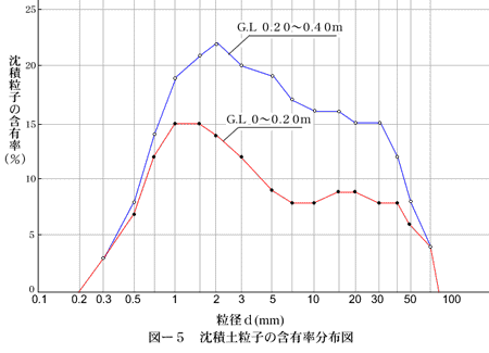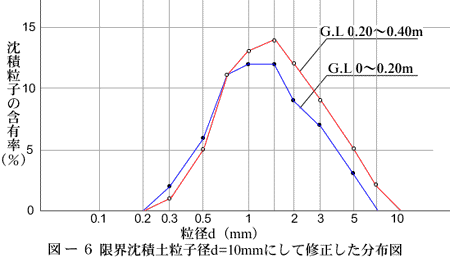 の関係となる。沈積した土粒子の平均粒径d=0.15cmで流速を求めると、v=22cm/sが得られ、測定した河川流速(V=25cm/s)にほぼ近い値である。