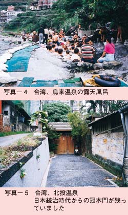 台北市付近には北投温泉をはじめ多数の温泉地があり、その多くは戦前の日本統治時代に開発されたもののようです。日本式の温泉施設が多数あり、日本人観光客でにぎわっているということでした。台湾人は大浴場で裸になって入浴する習慣はないそうですが、最近になって温泉入浴を楽しむ人が増え、温泉地は地元の人たちで一杯でした。烏来温泉では、深い谷底の川岸に多数の温泉が湧出しており、露天風呂がありました。日本と違って、水着を着た老若男女が、露天風呂に一杯に詰まって、食べたり飲んだりしながら温泉を楽しんでいました。