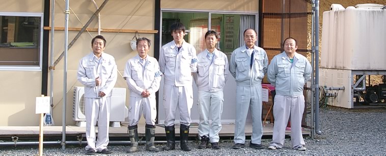 賠償井戸工事は、施工を担当する「共同企業体」と、住民の契約・金銭授受を代わりに行う「代行会社」の2つの組織で対応しています。現在共同企業体には5人、代行会社には2人が、専従職員として派遣されており、年内100本、年度内150本の井戸の完成引き渡しを目指して、大奮闘中です。また、会員各社から、井戸掘削施工班8~10組、設備施工班5組が現場で作業にあたっています。一つの村にこれだけ多数の深井戸工事の機械・人員が終結することは、おそらく県内・東北地方では例のないことと思われます。